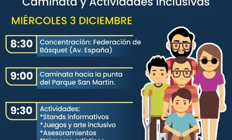 La propuesta se desarrollará el miércoles 3 de diciembre, iniciando a las 08:30 horas con la concentración en la Federación de Básquet (Av. España). A las 9 horas comenzará la caminata hacia la punta del Parque San Martín, donde se desplegará una agenda integral de actividades inclusivas abiertas a toda la comunidad.